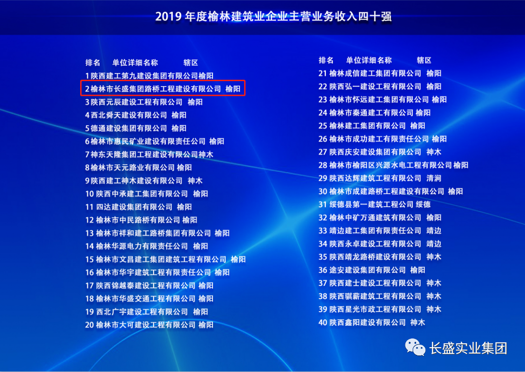 長盛路橋公司入榜榆林市建筑企業(yè)主營業(yè)務收入四十強和民營企業(yè)主營業(yè)務收入百強