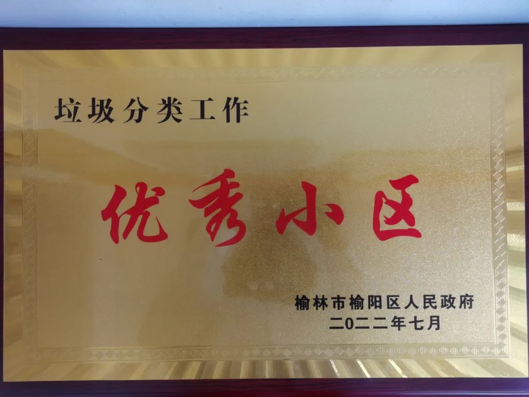 近日,因垃圾分類工作卓有成效。榆林市萬邦物業(yè)管理有限公司所接管的盛景家苑小區(qū)被榆陽區(qū)政府授予并由榆陽區(qū)環(huán)衛(wèi)局頒發(fā)垃圾分類優(yōu)秀小區(qū),并給授予了獎牌和綬帶。
