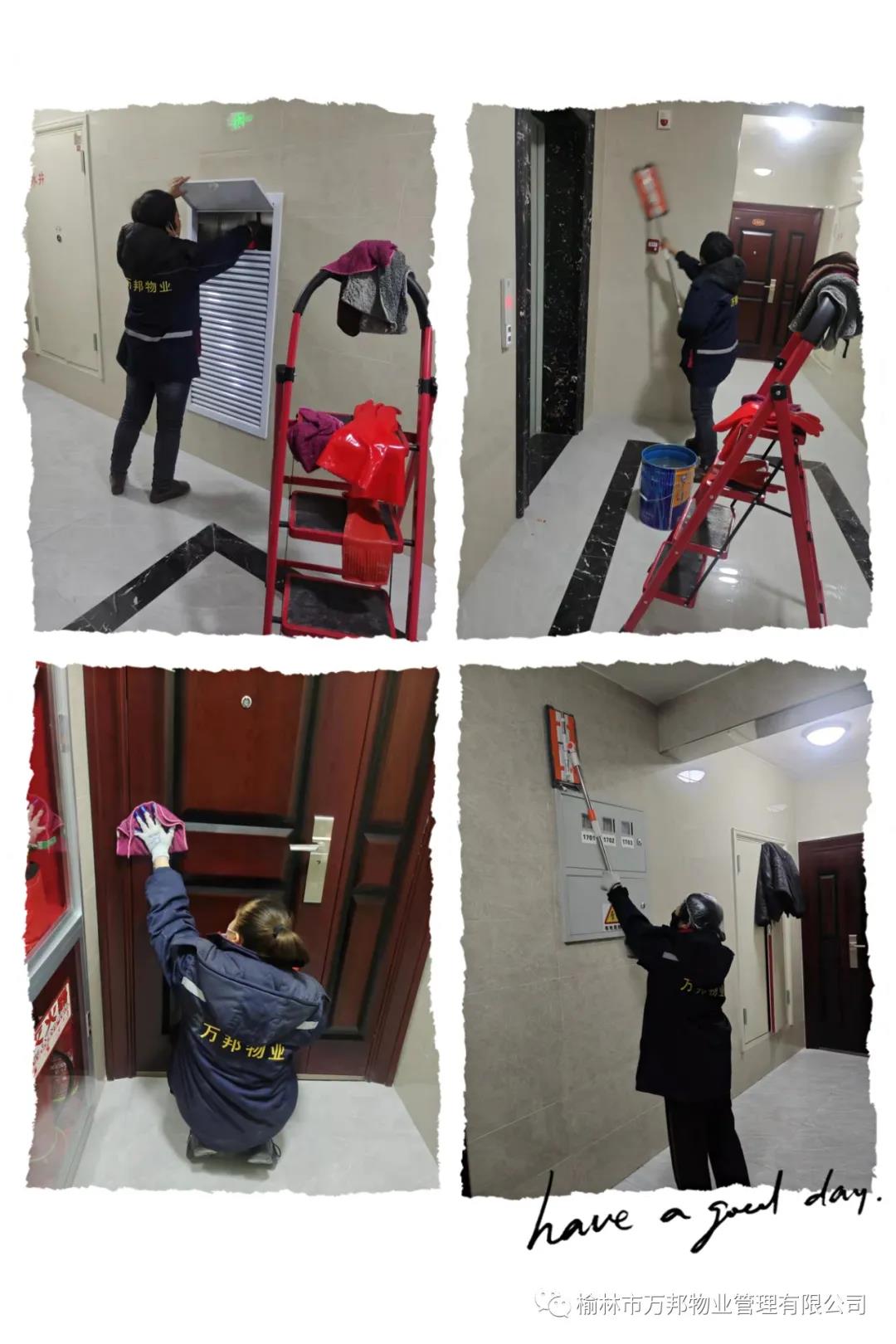 環(huán)境部工作人員使用專業(yè)的設(shè)備和清潔劑,對墻面、地面、及玻璃上的污漬及裝修殘留垃圾進(jìn)行清理,各項(xiàng)工作井然有序的進(jìn)行著!她們精心檫拭著每一個(gè)環(huán)節(jié),力求為業(yè)主營造出無污漬、光亮潔凈的居住環(huán)境!