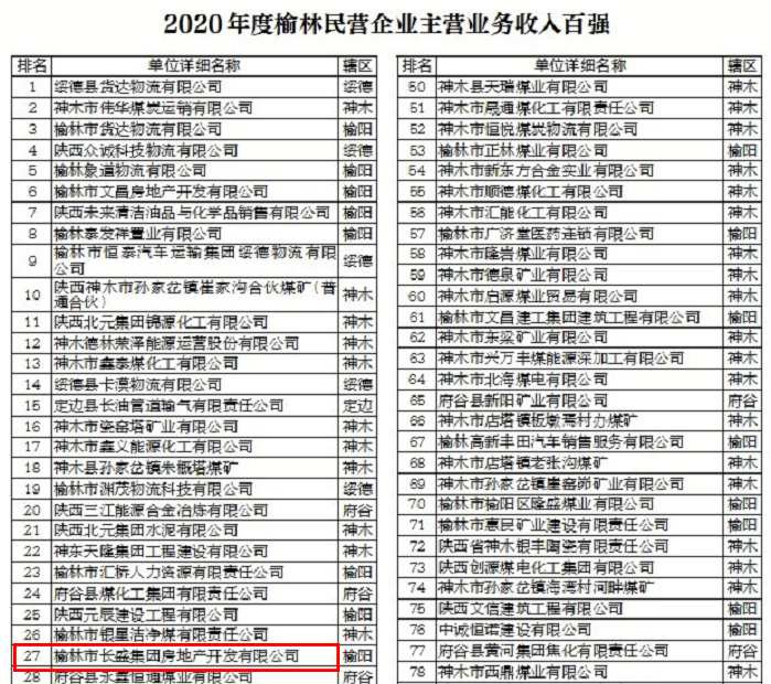 從公布的2020年度榆林民營(yíng)企業(yè)主營(yíng)業(yè)務(wù)收入百?gòu)?qiáng)名單中,榆林市長(zhǎng)盛集團(tuán)房地產(chǎn)開(kāi)發(fā)有限公司排第27名。