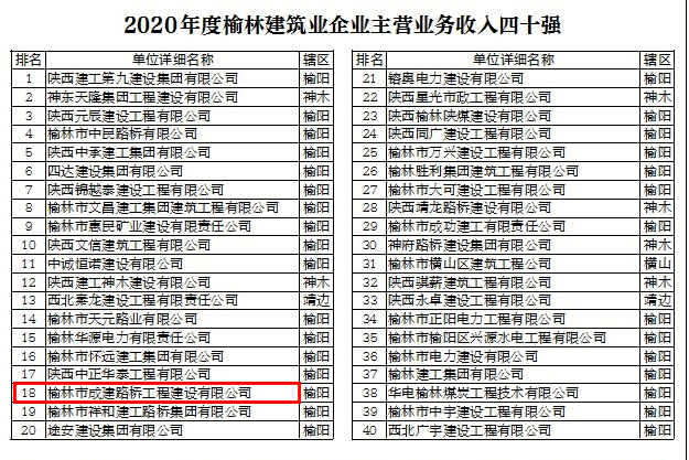 在公布的2020年度榆林建筑業(yè)企業(yè)主營(yíng)業(yè)務(wù)收入四十強(qiáng)名單中,榆林市成建路橋建設(shè)有限公司排第18名。